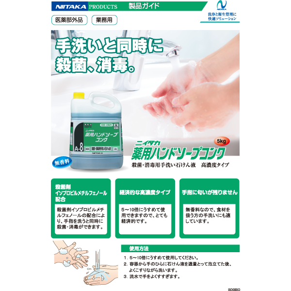 うすめずそのままでも使えるストレートタイプ。殺菌剤イソプロピルメチルフェノールの配合により、手指を洗うと同時に殺菌・消毒ができます。無香料なのでキッチンでの手洗いにも適しています。